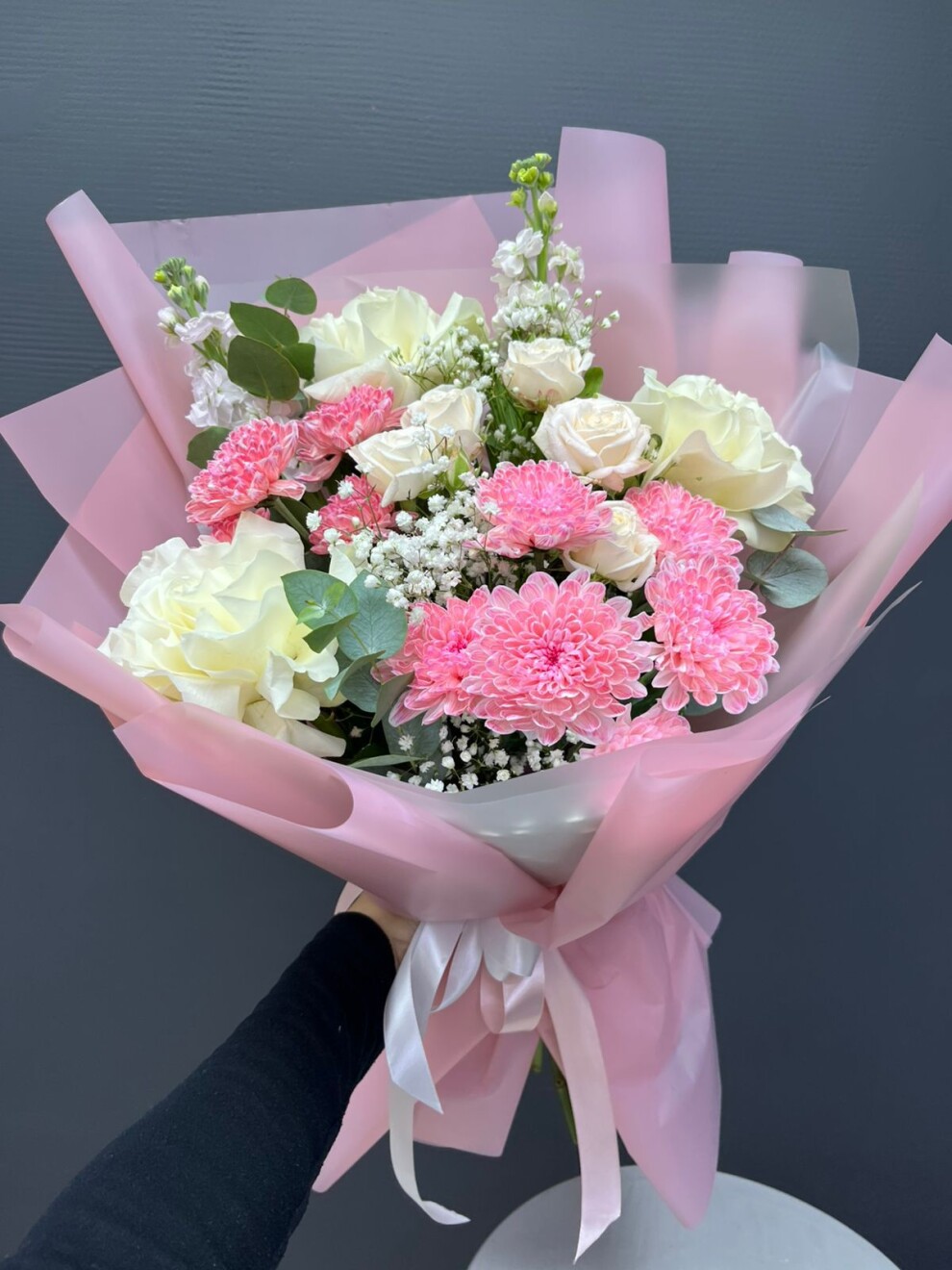 Авторский букет на основе одноголовой и кустовой розы с добавлением хризантемы, гипсофилы, маттиолы и декоративной зелени, в дизайнерской упаковке.