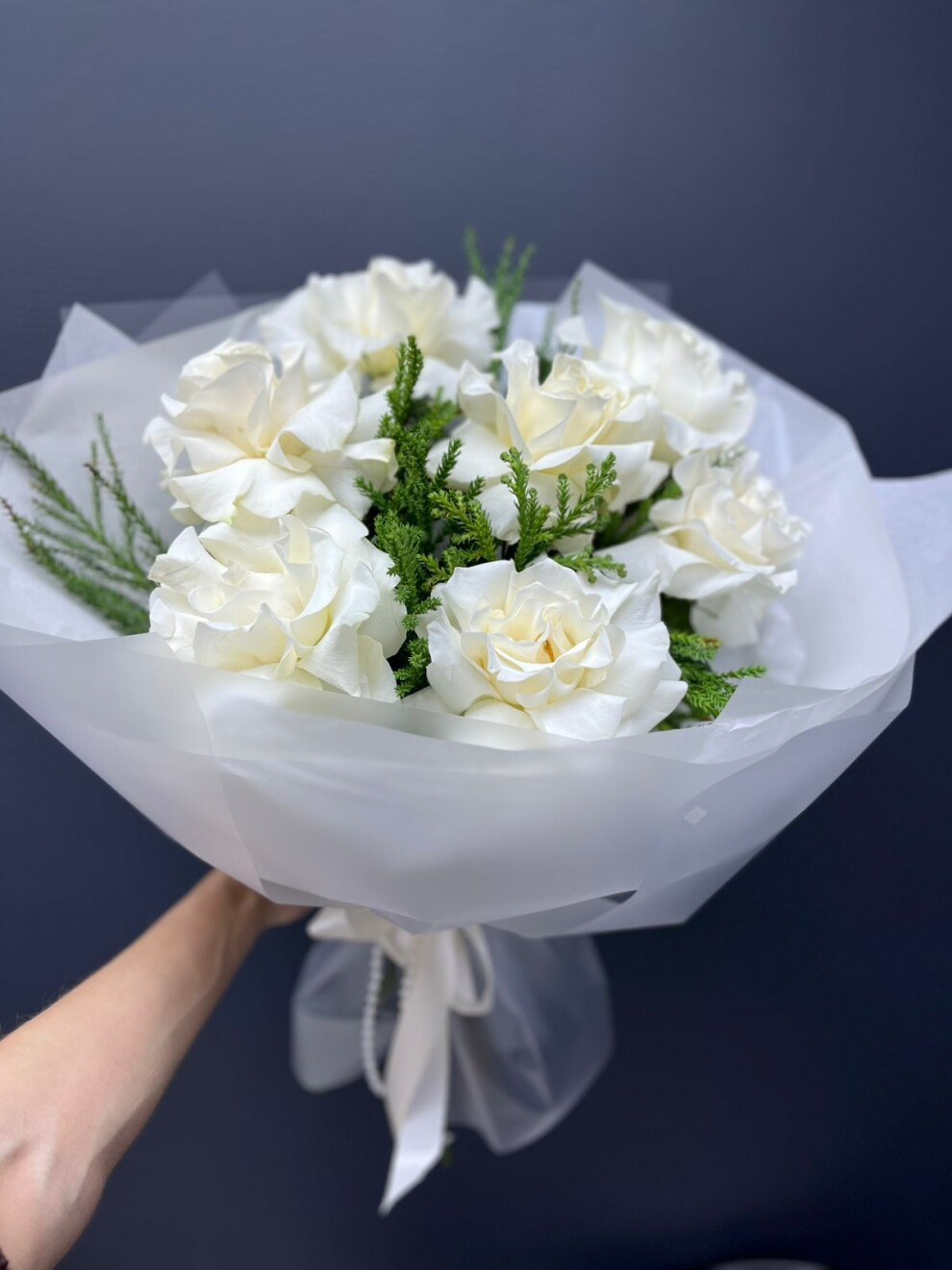Монобукет из 7 французских роз с добавлением декоративной зелени в дизайнерской упаковке