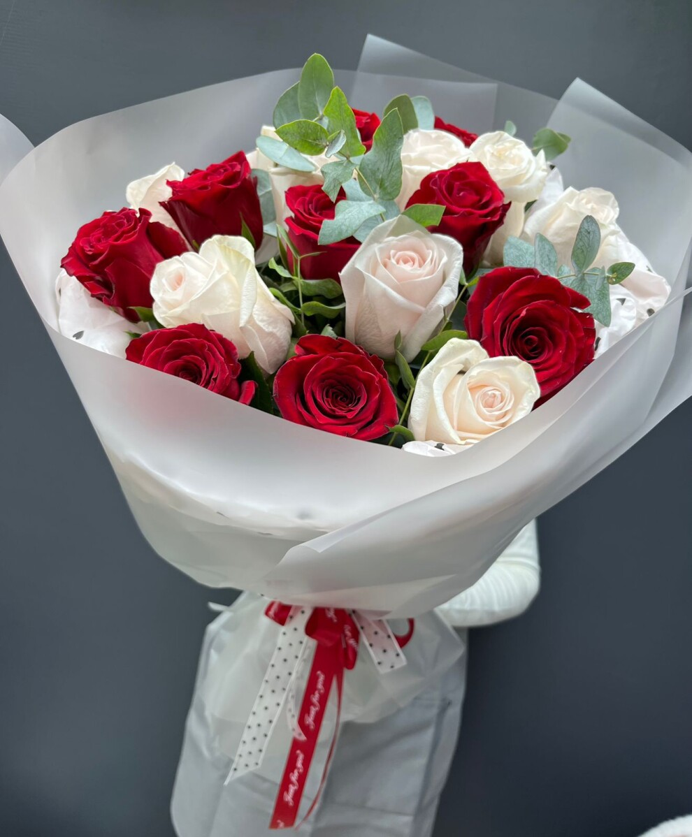 Монобукет из 19 роз с добавлением эвкалипта в дизайнерском оформлении