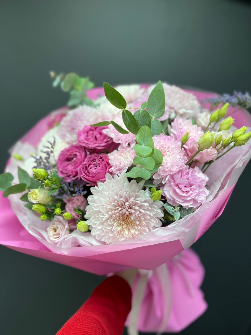 Авторский букет на основе кустовой и одноголовой хризантемы с добавлением кустовой пионовидной розы, эустомы, лимониума и эвкалипта в дизайнерском оформлении